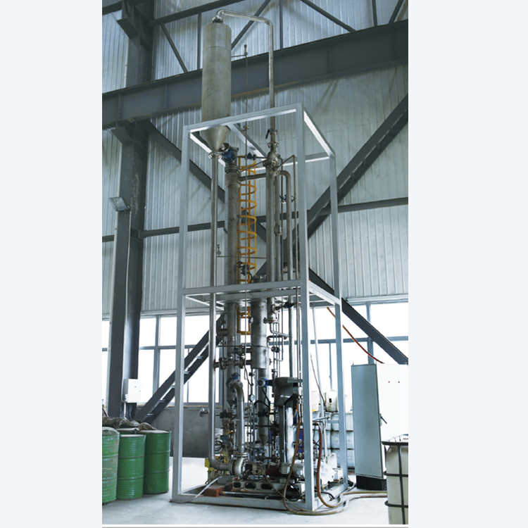 物料经进料泵(电动计量泵)加压后进入加热器的上部物料室,再经分料元件将物料分配到每一根换热管,物料在换热管内至上而下成膜状流动,在流动的过程中与壳程的蒸汽进行热交换并被加热到沸点,溶剂同时开始汽化,所以换热管内有汽液两相物料在同时运动。汽液混合物在加热器的下料室积聚并进行初步的汽液分离,下料室的顶流经汽液混合管被送至分离器进行进一步的汽液分离。分离器和加热器下料室的底流循环泵加压后进入下一个循环。