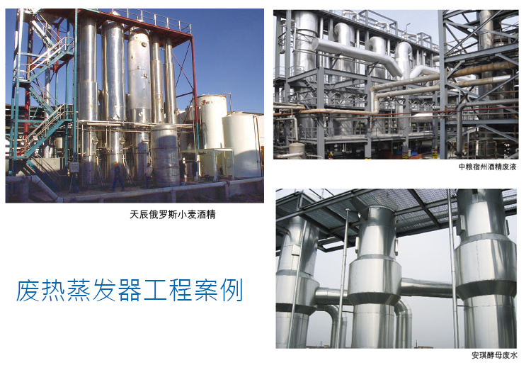 废热蒸发器是利用废热提供有效传热温差的蒸发系统。在化工、轻工、食品等工厂,生产工艺过程中总会产生一定量的低品质废热,例如淀粉厂副产品(纤维、蛋白、胚芽)和酒精厂DDGS干燥产生的二次蒸汽和冷凝水,酒精蒸馏所得的酒精蒸汽和废醪液,糖厂液糖化所得的液化液和糖化液,以及其他中间制品携带的显热或潜热,通过合理的设计均可再次利用于蒸发系统。液态废热可以对物料进行预热利用其显热,也可通过闪蒸得到闪蒸汽利用其潜热;汽态废热可直接利用其潜热。